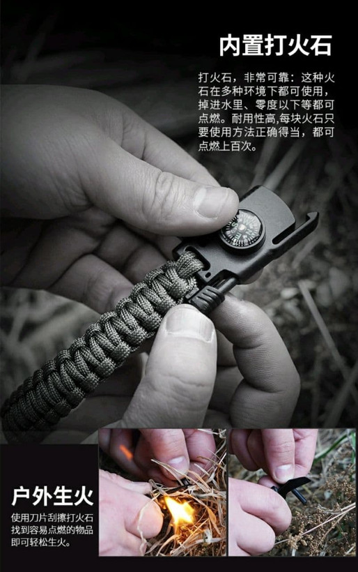 🔻این دستبند دارای چاقو برای بریدن طناب و استفاده در شرایط اظطراری ، قطب برای جهت یابی ، چخماغ برای درست کردن آتش ، سوت برای اطلاع رسانی و موارد دیگر و طناب پارکورد برای ساخت پناهگاه،تله و ... میباشد